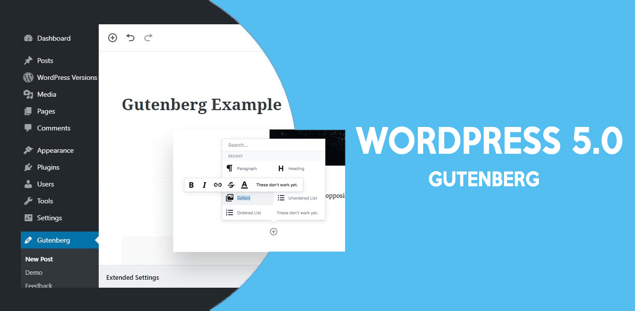 Os componentes de páginas são representados por blocos modulares, podendo ser acessados através de um menu de blocos unificado. O Gutenberg também introduz novos frameworks, padrões de interação, funcionalidades e experiências de usuário ao WordPress.